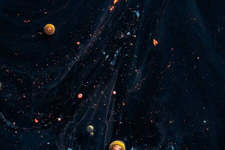 Paint in water. Artist and paints. Amazing macro photography in the form of space and planets. Abstract background for presentations.