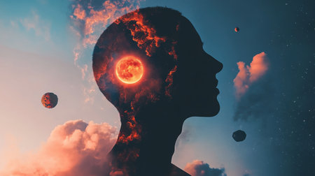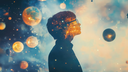 A surreal double exposure of a person silhouette filled with a vibrant galaxy and floating planets.