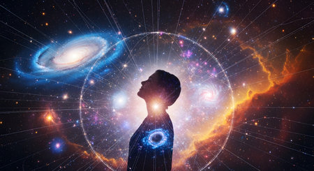 The silhouette of a person looking up is set against a magnificent cosmic background filled with galaxies, nebulae, and stars. Lines of light and energy connect the person to the universe, symbolizing consciousness, spirituality, meditation, and the profound connection between humanity and the cosmos.