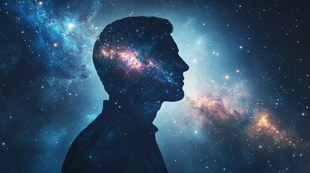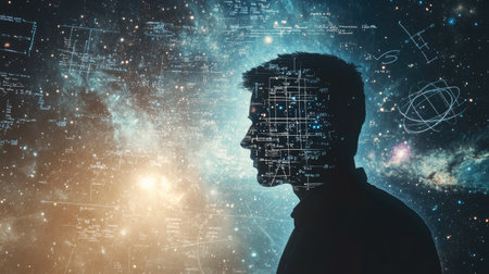 A manaes silhouette merged with cosmic imagery, including galaxies and mathematical formulas, representing the vast universe within each individual. Elements furnished by NASA