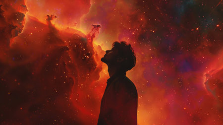 Silhouette of a man contemplating the beauty of a colorful cosmic nebula in space
