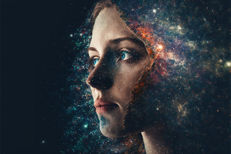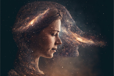 Universe and galaxy inside woman brain portrait double exposure, bright stars of milky way as metaphor concept for sense of human mind. Meditative and mental ability abstract art. Superb Generative AI