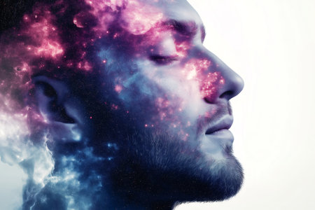 Profile of a man with closed eyes merging with a colorful nebula and stars, creating a cosmic and dreamy portrait