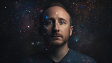 Portrait of a man in a cosmic space. Dark background.