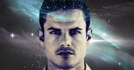 Contemplating with digital network overlay on face, man in cosmic background. Technology, futuristic, virtual reality, innovation, connection, contemplation