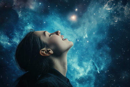 A woman gazes thoughtfully, her profile illuminated by soft light against a stunning cosmic landscape. Stars and galaxies swirl around her, showcasing a serene moment in a vibrant universe.