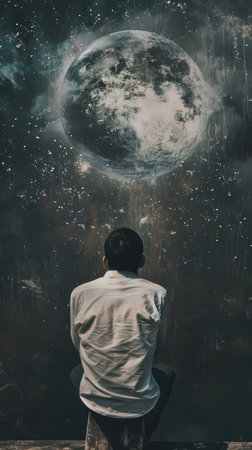 A man is sitting on a stool in front of a large painting of a moon. The painting is filled with stars and the man is looking up at it. Scene is peaceful and contemplative
