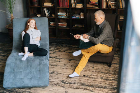 Attractive young woman with red hair lying on armchair talking about his problems with professional mature man psychotherapist or psychologist in cozy office room.