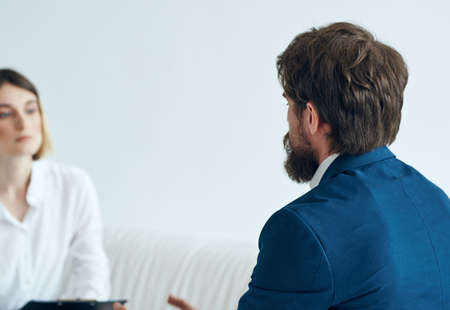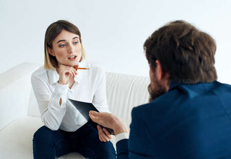 Business man in a classic suit and a woman on the couch with documents in the hands of a psychologist working