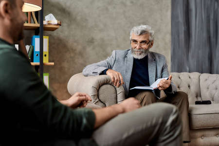 Middle aged bearded Caucasian man at an appointment with a psychologist. He delves into the problem and helps the patient solve it. The psychotherapist listens carefully to the patient’s story.