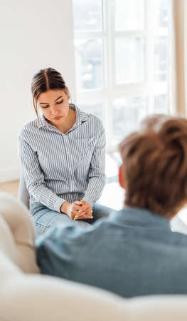 Sad young caucasian woman looking at psychotherapist