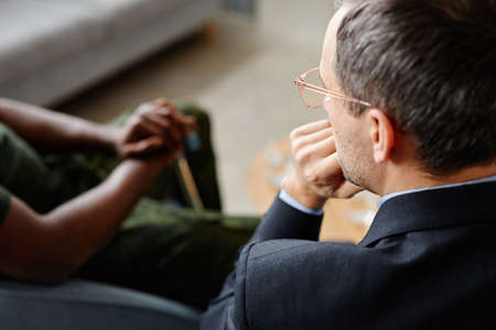 Mature psychotherapist wearing suit and eyeglasses listening to unrecognizable Black soldier during therapy session