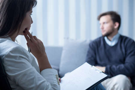 Photo of female psychoanalyst helping male patient with phobia