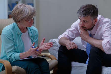 mature man having conversation with psychologist in consulting room