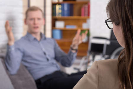 Man sitting in the psychologists office and talking about problems