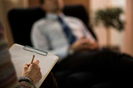 Close-up of psychotherapist writing a diagnosis while analyzing patient
