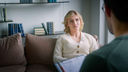 Adult woman (age 25-35) talking to a male therapist in psychologist clinic.
