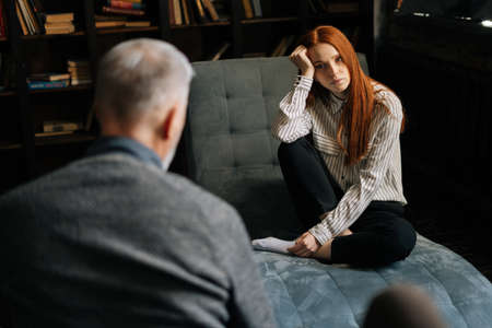 Attractive young woman with red hair lying on armchair talking about his problems with professional mature man psychotherapist or psychologist in cozy office room.