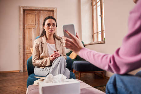 Therapist looking at the smartphone screen withs shocked expression while having session
