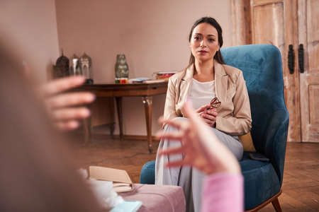 Photo of emotionally unstable woman during session with psychologist