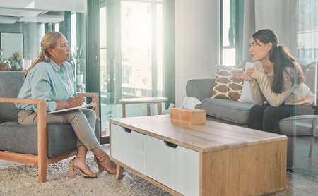 Young woman talking with a professional therapist, psychology and mental health concept