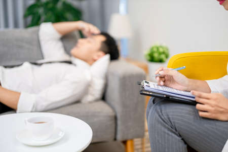 Caucasian man patient lying on a couch during the therapy.