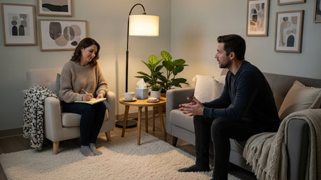 Two individuals engage in a counseling session within a warmly lit room. The scene depicts a therapist taking notes while the patient gestures and speaks. Neutral tones and soft textures characterize the setting. This imagery is suitable for editorial or commercial applications regarding mental health and wellbeing.