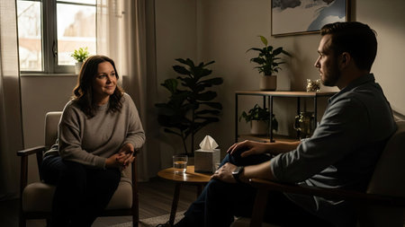 An image displays two individuals engaged in conversation within a warmly lit interior. The scene features a therapist and patient seated in comfortable chairs near a window, suggesting a counseling environment. The composition includes neutral colors, soft lighting, and an overall sense of calm. The image could be suitable for editorial and commercial applications.