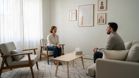 A therapist and client are seated in an office, engaged in a counseling session. The scene shows a well-lit interior with neutral colors and framed art. They appear to be in a focused conversation. This image is suitable for various editorial and commercial applications related to mental health and therapy.