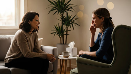 In an interior space, a woman consults with a therapist. The scene features neutral tones and soft lighting. The composition includes chairs, a table, and decorative elements. This image may be used for editorial content related to mental health or therapeutic practices, as well as for general healthcare projects.
