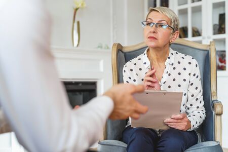 Mature gray-haired male psychotherapist with clipboard in session with female patient. Smiling caucasian woman at a psychologist appointment.
