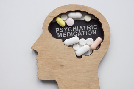 Model of a head with pills and an inscription psychiatric medication.
