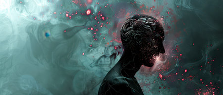 A digital art piece depicts a human silhouette with a detailed brain. The silhouette's face is turned to the side with an open mouth, as if they are screaming. The brain is visible through the head, revealing intricate details of its structure. The background is filled with swirls of teal and white paint, with small red circles scattered throughout.