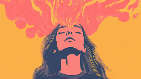 This vibrant artwork features a profile of a woman with a pink brain, surrounded by cheerful suns and whimsical stars. The image radiates positivity and creativity, blending elements of surrealism and pop art to evoke a sense of joy and inspiration.