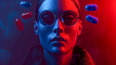 a person with glowing eyes in front of a red and blue light