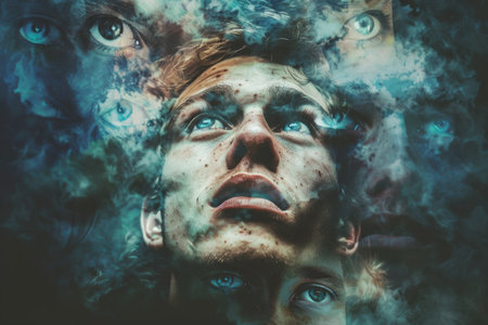 Conceptual portrait with man surrounded by his multiple personalities. Depressed person with multiple personality disorder