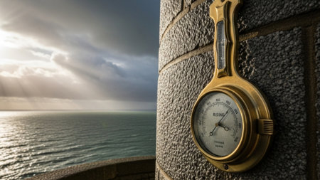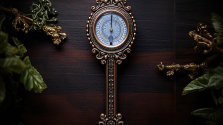 Panoramic ultrawide 16:9 cinematic photograph of a classic brass aneroid barometer mounted on the ex
