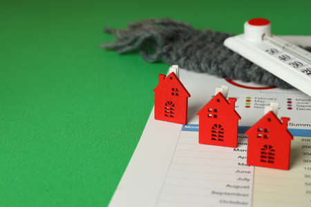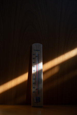 Mercury thermometer inside apartment room, Celsius scale, lit by streak of sunlight. Close up shot, no people, wooden background.