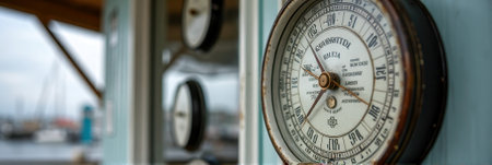 Vintage nautical barometer on old ship with weather gauges in marina. That the image is generated using AI.