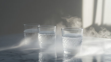 This captivating image features three clear glasses of water surrounded by wisps of mist, elegantly set on a marble surface. The soft natural light creates a serene atmosphere, enhancing the beauty and simplicity of the scene.