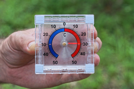 thermometer on the window pane against the blue sky shows the temperature above 30 degrees Celsius
