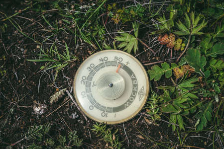 Round soviet thermometer with arrow shows temperature of more than fifty degrees Celsius. Thermometer with inscription Moscow lies on ground among vegetation. Russia, Altai mountains, 10 July, 2020.