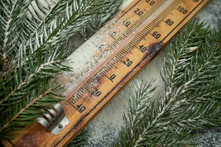 Thermometer shows low temperature and Christmas decoration on white with stars festive background. Winter and holiday weather concept, copy space