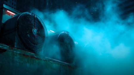 Large industrial fans expel steam in an urban environment, creating a moody and atmospheric scene.