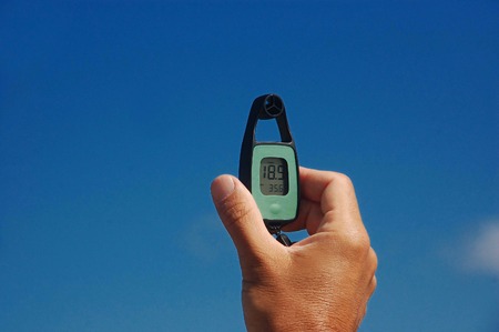 Best personal weather station device with weather conditions inside and outside. A girl holds a gadget in her hand on a background of green foliage.