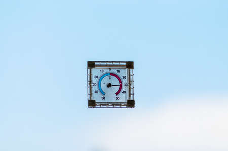 Sub-zero temperature on the thermometer outside the window. Winter. Selective focus.