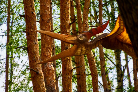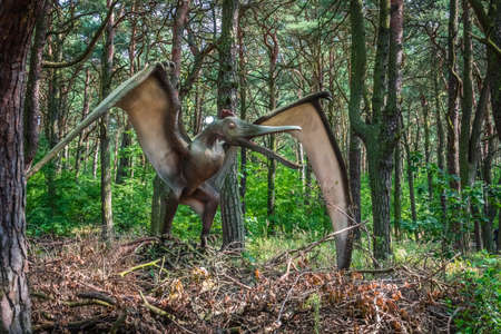 Dinosaur statue in the forest park in nature for background. Realistic model of Pterosaur, Trias- Cretaceous 248-65 million years ago. In the Dinopark, Turkey, Goynuk. Prehistoric era dinosaur
