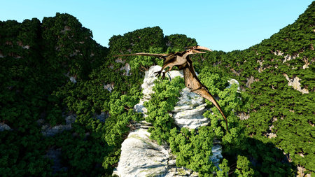 pterodactyl on rocky cliffs. prehistoric nature, dinosaurus. 3d rendering
