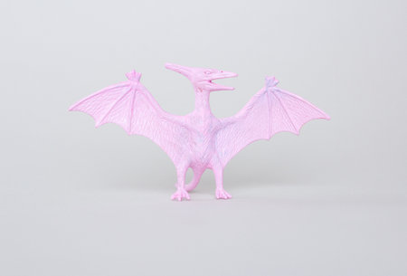 Small pterodactyl toy on gray background, little pink plastic dinosaur figurine collection, prehistoric animals pop up concept