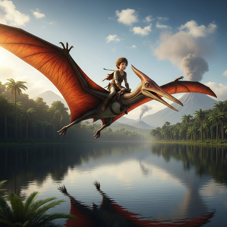 A young boy rides a large pterodactyl over a serene tropical lake, surrounded by lush greenery and a volcanic landscape under a blue sky with clouds.